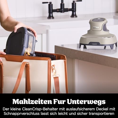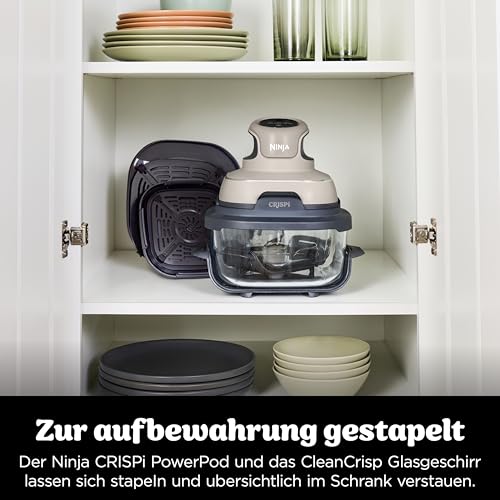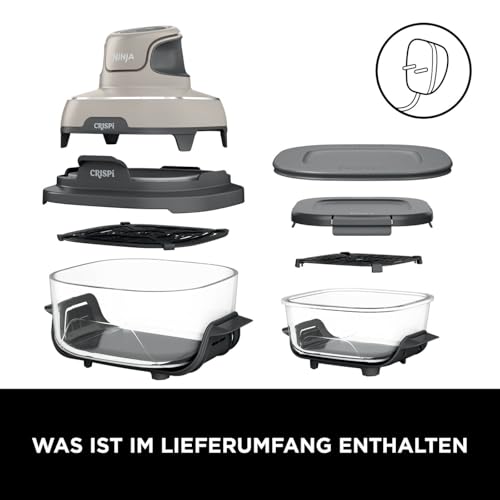 Ninja CRISPi tragbare Air fryer Heißluftfritteuse, 3,8 l, 4-in-1: Heißluftfrittieren, Braten, Warmhalten, Recrisp, kompakt, 6 Portionen, 2x herausnehmbare Glasbehälter & Deckel, 1700W, Stein FN101EUST