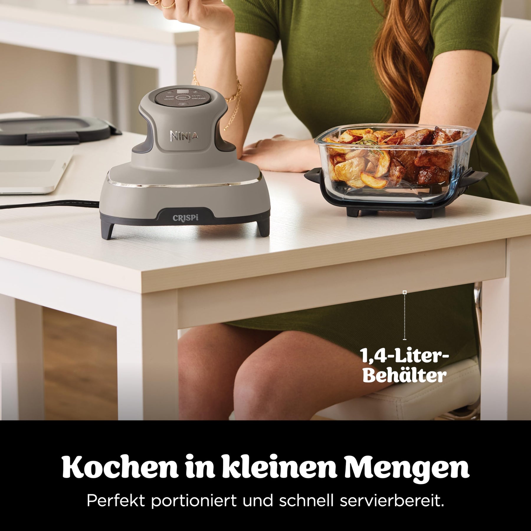 Die Ninja CRISPi 4-in-1 tragbare Glas-Heißluftfritteuse bietet die Leistung einer großen Air Fryer im kompakten Format. Der leichte 1.700-W-PowerPod wird einfach auf einen der Glasbehälter gesetzt und ermöglicht vier Kochfunktionen für schnelle, gesunde Mahlzeiten für Einzelpersonen oder Familien. Dank platzsparendem Design, pflegeleichter Glasbehälter und tragbarer Bauweise ist sie die ideale Lösung für moderne Küchen, Büros und unterwegs.