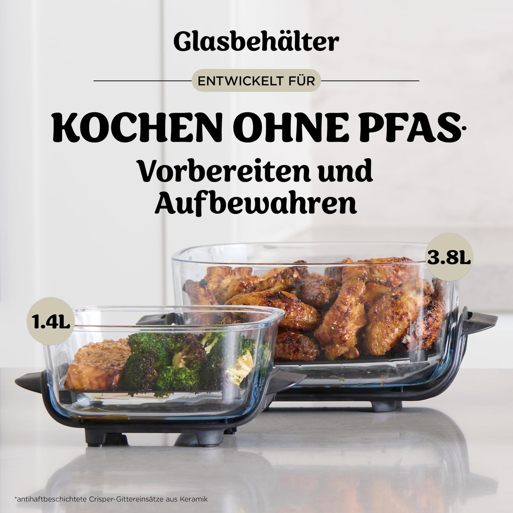Glas-Kochfläche ohne PFAS. Thermoschockbeständige CleanCrisp-Glasbehälter für gesundes Kochen und sicheres Aufbewahren. Spülmaschinenfest für eine einfache Reinigung. Keramische Antihaft-Knusperbleche sorgen für knusprige Ergebnisse.